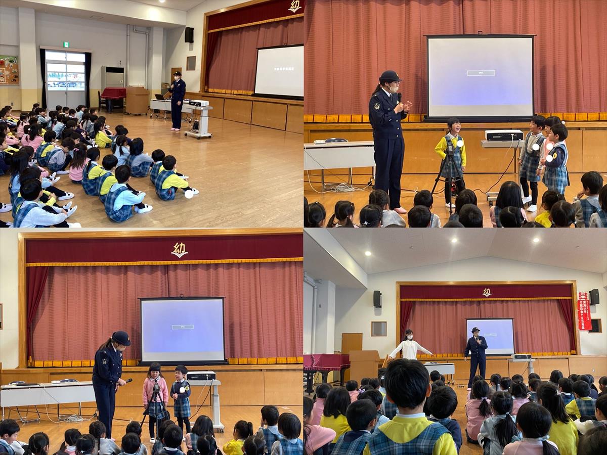 警察官の方が来てくださり、小学校に向けて防犯のお話をしていただきました。
